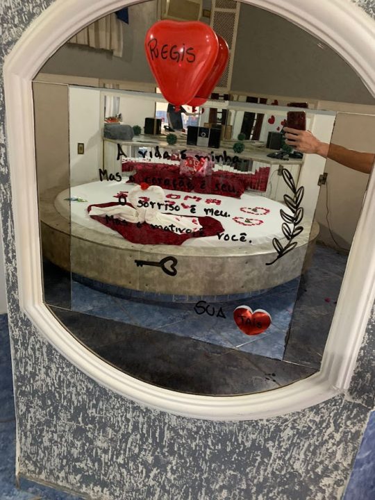 Boa opção pra quem só precisa dormir para descansar durante a viagem pois é barato e ao lado da rodovia. O quarto é antiquado e muito brega. Parece um calabouço medieval… É verdade, gente! Nao tenho intenção de falar mal do local, so estou sendo sincera 😀. Para dormir e descansar durante a viagem nos serviu muito bem! Mas para quem quer namorar e curtir dormir fora de casa…. o quarto deixa a desejar.